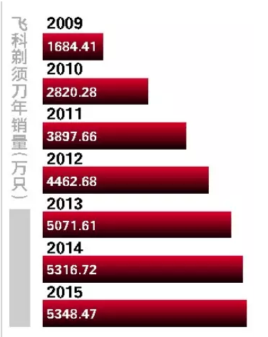 根据中国商业联合会与中华全国商业信息中心联合发布的数据显示,2010—2014年,飞科已连续5年成为国内电动剃须刀市场综合占有率第一名,超过飞利浦、博朗、松下等品牌。2009年至2015年,飞科剃须刀分别实现年销量1684.41万只、2820.28万只、3897.66万只、4462.68万只、5071.61 万只、5316.72万只、5348.47万只。