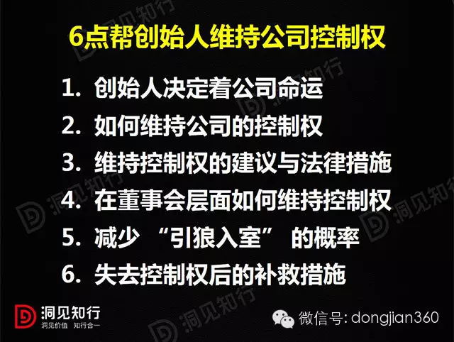 所以在引入投资人的时候,我们也需要对投资人做一个分析,以减少投资人主动采取一些措施抢占公司控制权的概率。财务投资人目的往往相对比较简单,就是把钱投进来以后,经过若干年公司发展,退出实现财务回报;战略性的投资人的目的可能会更加深远,并且往往会愿意以比财务投资人更高的价格投进来,为了配合他自己的战略。所以战略投资人往往更有可能想要去夺取公司的控制权。这样我们再引入投资人的话,一定要进行谨慎分析,到底是去引入一个战略投资人还是财务投资人。如果要引入战略投资人的话,一定要对投资人的目的做出清晰准确的判断,需要更谨慎地按照前面提到的在股东会层面和董事会层面,为加强创始股东的控制权去做一些设计。