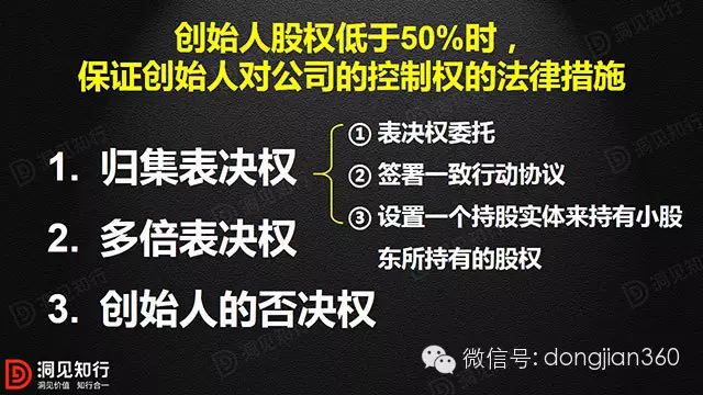 创始股东的股权虽然低于50%,但是在公司章程里面约定创始人的每一股股权拥有多个表决权(譬如10个),这样能够大大地增加创始股东在股东会的表决权利。前面这两种方式都是积极主动的增加创始人在公司的控制权一种的方式和策略。