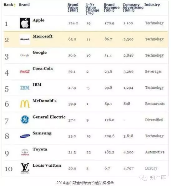 现在,大家一起来看看2014年福布斯全球最有价值品牌榜单的前10名: