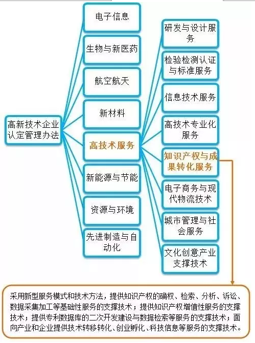 在《国家重点支持的高新技术领域》中,提及“知识产权与成果转化服务”,详见下图: