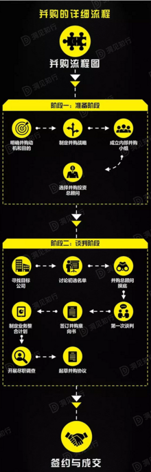 并购过程一般可分准备阶段、谈判阶段和签约、成交阶段,其具体步骤为: